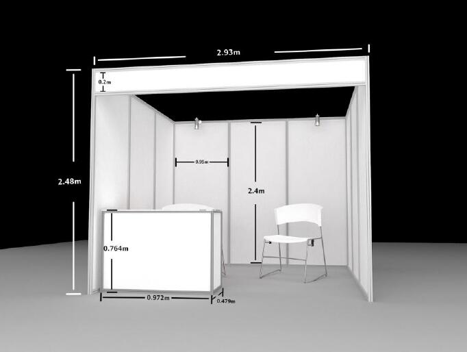 標準展位分為雙面開口與單面開口,雙面開口指拐角處,有兩面面向觀眾通道,此類展位比單面開口展位費加收10%。標展的配置有兩盞射燈,一張簡易條形桌(約,長1米×寬0.5米×高0.75米),兩把折椅,一個電源插座(5A/220V),電源容量最大為500W。